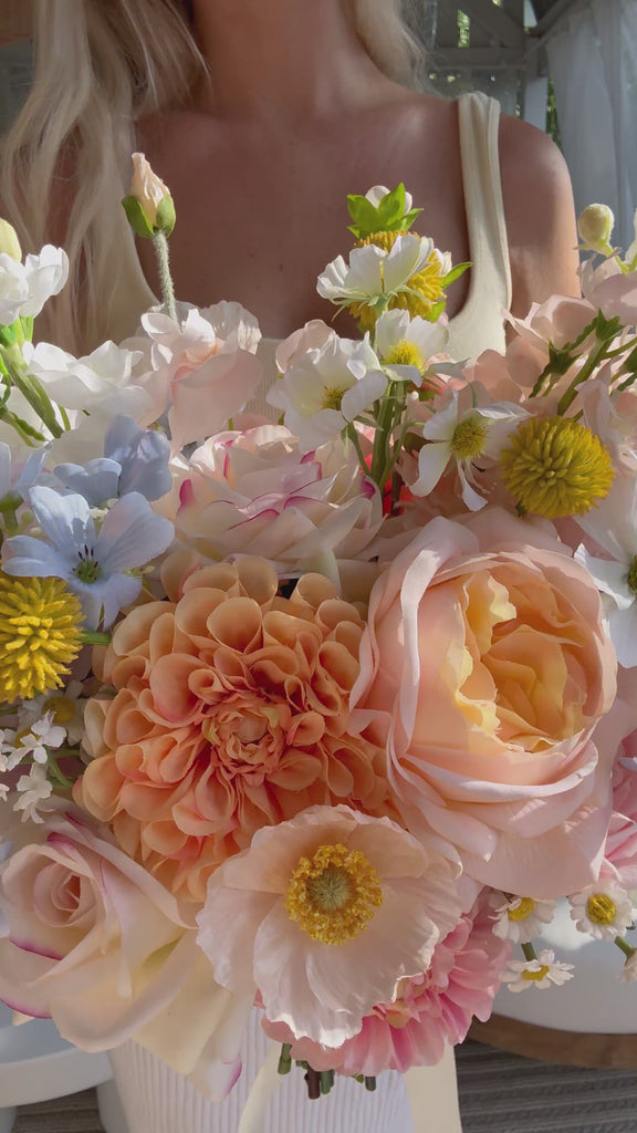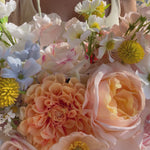 Peach dahlias, blush garden roses and pastel blooms - soft, sweet and styled to perfection